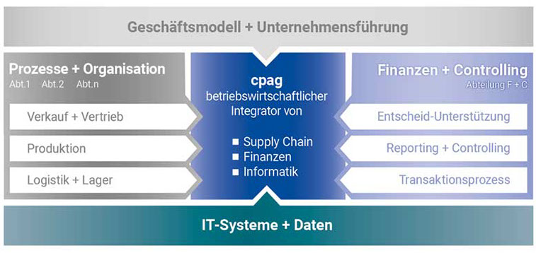 Für die elektronische Vernetzung der rechnungswesen-relevanten Daten aus den Geschäftsprozessen mit dem Bereich Finanzen und Controlling arbeitet cpag mit qualifizierten IT-Partnern und eBusiness-Spezialisten zusammen. Situativ zieht cpag für die Lösungs-entwicklung weitere Fachexperten bei.