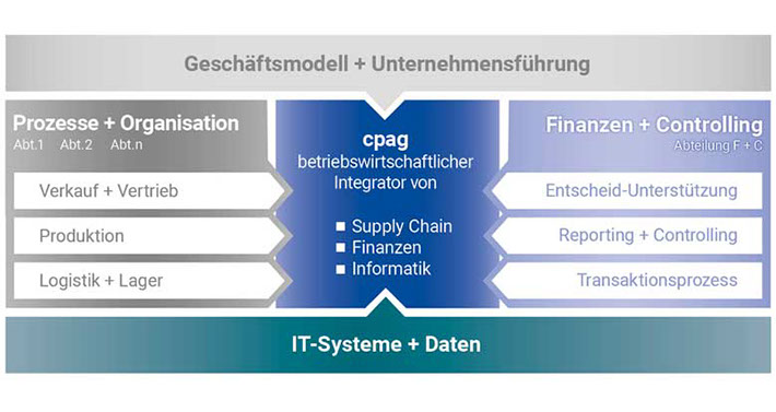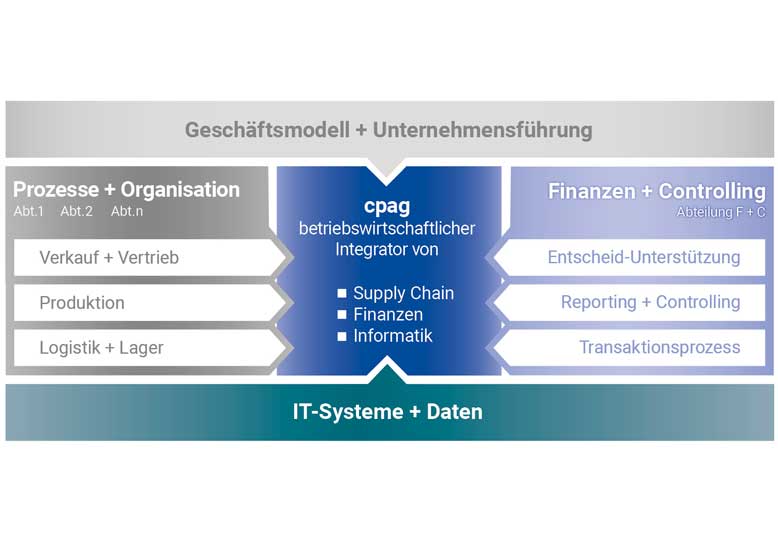 Für die elektronische Vernetzung der rechnungswesen-relevanten Daten aus den Geschäftsprozessen mit dem Bereich Finanzen und Controlling arbeitet cpag mit qualifizierten IT-Partnern und eBusiness-Spezialisten zusammen. Situativ zieht cpag für die Lösungsentwicklung weitere Fachexperten bei.
